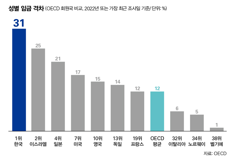 이는 대한민국의 사례와 매우 대조적이다. 우리나라는 2022년 기준 여러 성별 격차 지수 중 성별 임금 격차가 31.1%로, OECD 국가 중 1위를 차지했다. 근로자 중 정중앙인 중위임금을 받는 남성이 여성보다 31.1%를 더 받는다는 뜻이다. 해당 연도에 OECD 38개 회원국의 평균 성별 임금 격차는 12%였다. 더구나 우리나라는 1996년 OECD 가입 이래 26년 동안 줄곧 회원국 중 성별 임금 격차 1위 타이틀을 내려놓지 않고 있다.