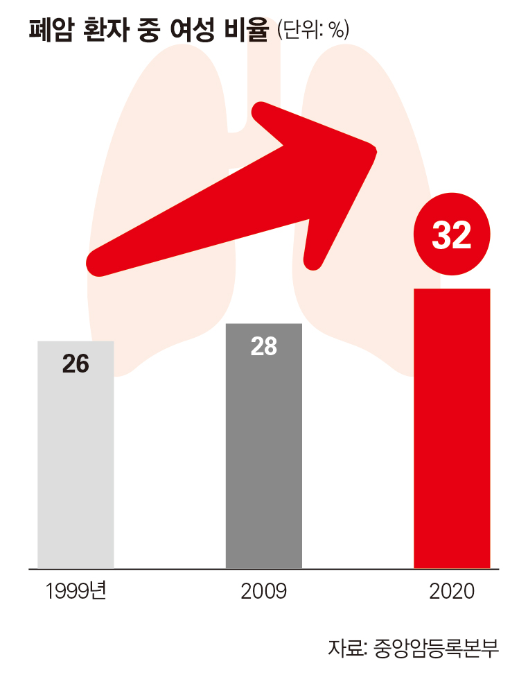 중앙암등록본부의 자료를 보면 지난해 국내에서 발생한 폐암 여성 수는 약 1만 명이다. 이는 한 해 발생하는 폐암 환자의 3분의 1에 해당하는 수치다. 전체 폐암 환자 중 여성 비율은 2000년 이후 꾸준히 상승해 2009년 28%에서 2020년 32%로 높아졌다. 그런데 여성 폐암 환자의 대부분은 비흡연자다. 서울시보라매병원 호흡기내과 연구팀이 2022년 진행한 연구에서 여성 폐암 환자의 94%는 비흡연자로 나타났다. 또 2003~15년 분당서울대병원에서 폐암 수술을 받은 여성 환자의 93%는 비흡연자였다. 여성 폐암 환자 10명 중 9명은 흡연이 아닌 다른 원인으로 폐암에 걸린 것이다.