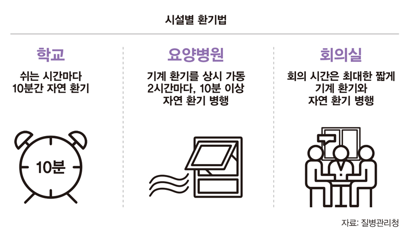 환기는 요리 매연을 배출할 뿐만 아니라 코로나19 같은 감염병 예방에도 큰 효과를 보인다. 질병관리청은 가정뿐만 아니라 학교·요양병원·사무실에서 평소 2시간마다 10분 이상의 환기를 권고한다. 학교에서 인공 환기 장치를 상시 가동하고 쉬는 시간 10분간 자연 환기를 병행하면 병원균의 공기 전파 위험도가 10% 이하로 감소한다는 것이다. 요양병원에서도 인공 환기 장치를 상시 가동하고 2시간마다 10분 이상 자연 환기를 병행할 때 공기 전파 위험도는 30% 미만으로 감소한다. 일반 사무실에서는 인공 환기 장치를 상시 가동하고 수시로 자연 환기를 병행해야 한다. 특히 회의 시간을 짧게 할수록 공기 전파 위험도가 떨어진다. 환기 없이 2시간 회의할 경우 공기 전파 위험도가 100%라면 자연 환기와 인공 환기를 하면서 1시간 회의할 때는 그 위험도가 20% 미만으로 낮아진다. 지영미 질병관리청장은 “이번에 개정된 환기 수칙으로 주요 집단 발생 시설에서의 안전한 실내 환기 환경이 조성되길 기대한다”고 밝혔다.