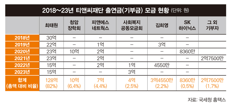 그럼에도 이혼소송 2심 재판부는 티앤씨재단 출연금을 ‘김 이사장과의 관계 유지 등’에 들어간 돈으로 판단했다. 오롯이 공익 목적으로 티앤씨재단에 사재를 내놓은 건 아니라는 취지다. 김 이사장의 활동 근거지인 티앤씨재단의 재원이 최 회장에 집중돼 있다는 점도 무시하기 힘들다. 2018~23년 티앤씨재단이 받은 기부금은 총 156억원이다. 이 중 최 회장 출연금(128억원)이 82.0%를 차지한다. 그 외의 기부자도 최 회장과 직간접적으로 연결돼 있다.