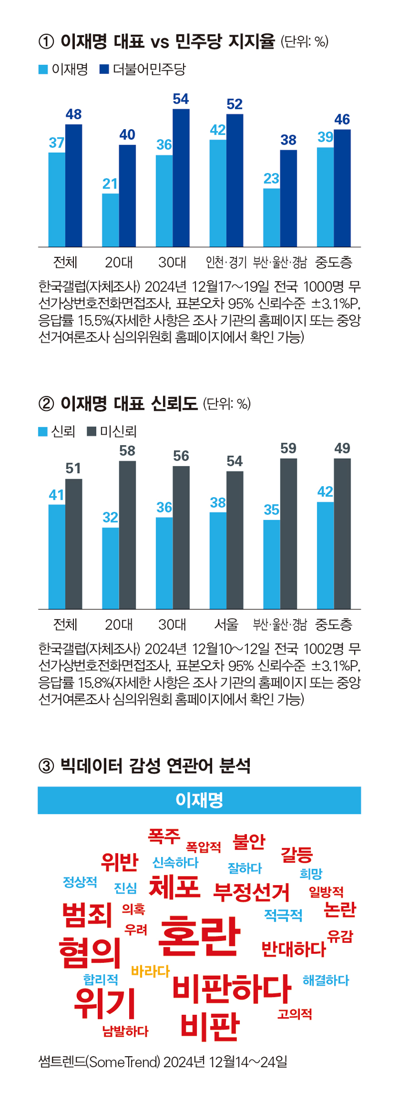 이유가 뭘까. 이 대표 자신에 대한 리스크가 완전히 해소되지 않았기 때문이다. 한국갤럽이 12월10~12일 실시한 조사(자세한 개요는 그래프에 표시)에서 ‘이 대표에 대해 신뢰하는지, 신뢰하지 않는지’ 물어보았다. ‘신뢰한다’는 41%, ‘신뢰하지 않는다’는 51%로 나왔다. 탄핵 국면에서 상대적으로 많은 반사이익을 얻을 수 있음에도 이 대표에 대한 신뢰 수준은 절반이 채 되지 못했다. 호남을 제외하고 전 지역에서 신뢰하지 않는다는 응답이 더 많았다. 연령대별로 보면 40·50대를 제외하면 신뢰하지 않는다는 의견이 더 높았다. 중도층에서는 ‘신뢰한다’ 42%, ‘신뢰하지 않는다’ 49%로 나왔다(그림②). 오직 이 대표만 놓고 신뢰 여부를 물었는데 ‘신뢰하지 않는다’는 의견이 대체로 더 많은 결과다. 윤 대통령에 대한 신뢰가 바닥으로 추락했지만 그렇다고 해서 이 대표에 대한 신뢰나 지지가 더 높이 올라가지도 않은 상태다. 즉 이 대표의 사법적 의혹이 여전히 해소되지 않았다는 인식이다.