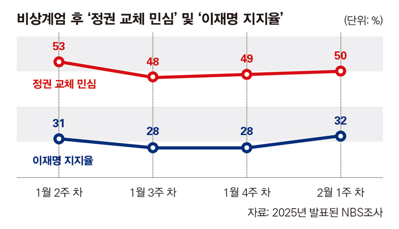새해 들어 엠브레인퍼블릭, 케이스탯리서치, 코리아리서치, 한국리서치가 진행한 NBS조사에 따르면, ‘정권 교체’ 여론은 53%(1월 2주 차)→48%(1월 3주 차)→49%(1월 4주 차)→50%(2월 1주 차)의 흐름을 보였다. 같은 기간 ‘차기 대통령 적합도’ 조사에서 이 대표 지지율은 31%(1월 2주 차)→28%(1월 3주 차)→28%(1월 4주 차)→32%(2월 1주 차)로 나타났다.(표본오차 95% 신뢰수준에서 ±3.1%포인트, 자세한 내용은 중앙선거여론조사심의위원회 홈페이지 참조)