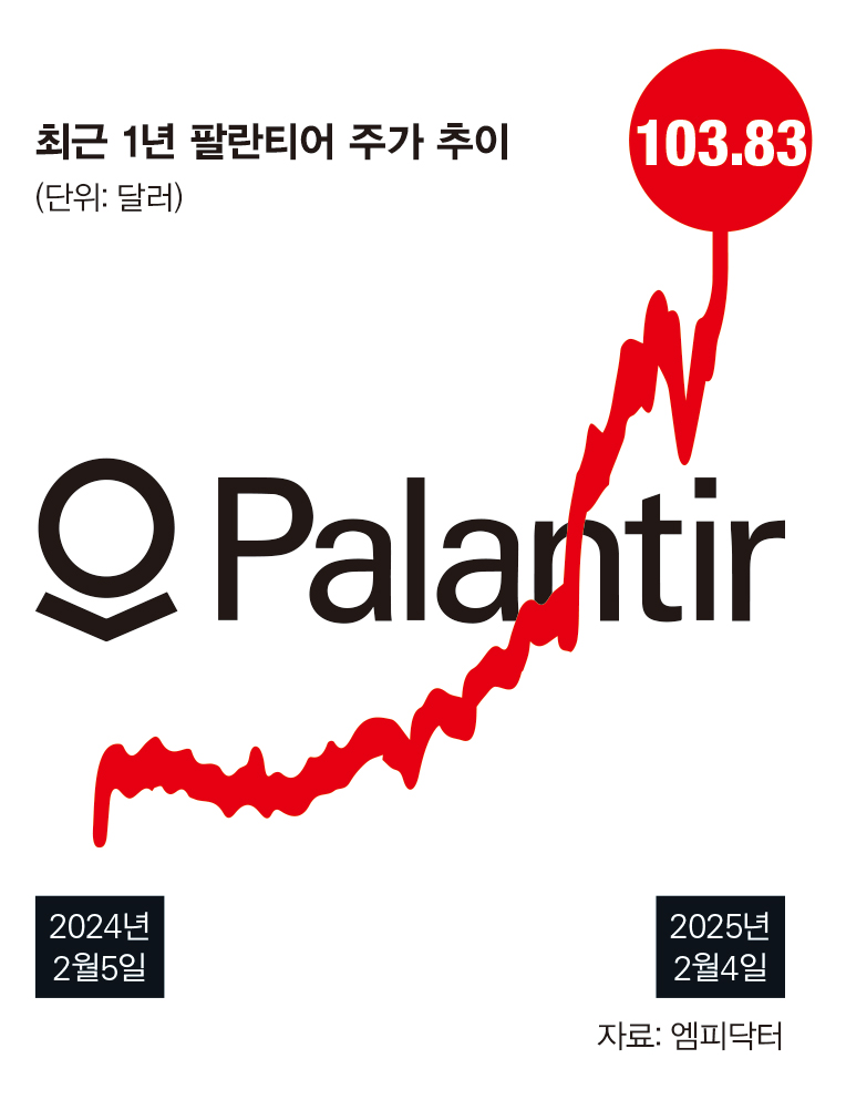 지난 1년 동안 주가가 5배 오른 팔란티어는 대표적인 성공 사례다. 올해 국내 서학개미들이 가장 열광하고 있는 미국 주식은 팔란티어라고 해도 과언이 아니다. 팔란티어 주가는 지난해에만 340% 급등했다. 최근 1년 동안 5배 이상 오르면서 시가총액은 400조원 수준까지 급증했다. 올해 들어서도 벌써 2월18일 기준 58.5%나 뛰었다.