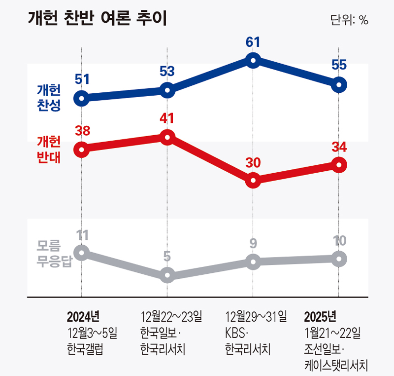 비상계엄 선포 당일인 작년 12월3일부터 사흘간 한국갤럽이 실시한 ‘현행 대통령제 개헌’을 묻는 여론조사에서 ‘필요하다’는 응답은 51%, ‘필요치 않다’는 응답은 38%로 조사됐다. 윤 대통령 탄핵소추안이 통과된 후 작년 12월22~23일 한국일보·한국리서치 조사에서도 개헌 찬성 응답이 53%였고, 이어 실시된 KBS·한국리서치 조사(12월29~31일)에서 ‘개헌이 필요하다’는 응답은 61%였다. 올해 들어서도 민심의 흐름은 유사하다. 조선일보가 케이스탯리서치에 의뢰해 1월21~22일 실시한 조사에선 55%가 개헌이 필요하다고 답했다.