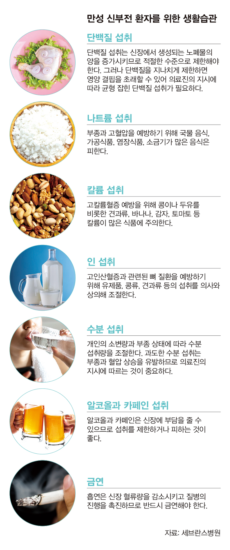 말기 신부전 치료를 받는 사람도 진통제 복용에 주의해야 한다. 또 신장에 좋다고 알려진 건강보조식품에 의존하기 쉬우나, 이는 오히려 신장 상태를 악화시킬 수 있다. 김효상 교수는 “신장을 이식받은 환자는 정상 신장 1개로 생활하므로 (진통제 복용에 대해) 일반인보다 더 주의해야 한다. (진통제를 장기간 복용하면) 투석 환자는 그나마 조금 남아있는 신장 기능이 더 악화될 수 있다.