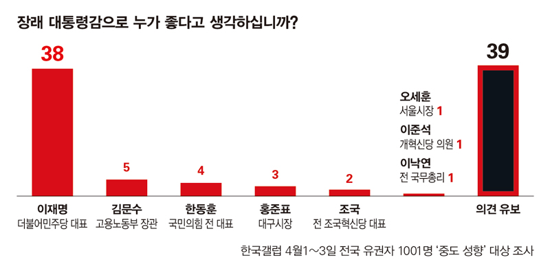 결국 대선 승패의 키는 중도층이 쥐고 있다는 분석이다. 장래 정치 지도자 선호도를 묻는 여론조사를 보면, 중도층에서 이재명 대표가 압도적인 1위를 기록했지만 특정인을 꼽지 않은 응답자도 39%에 이르렀다. 한국갤럽이 4월1~3일 전국 유권자 1001명 중 스스로 중도 성향이라고 한 응답자에게 장래 대통령감으로 누가 좋은지 물은 결과, 이재명 대표가 38%로 가장 높았다. 김문수 고용노동부 장관이 5%로 뒤를 이었고, 한동훈 전 대표 4%, 홍준표 대구시장 3%, 조국 전 조국혁신당 대표 2%, 오세훈 시장, 이준석 개혁신당 의원, 이낙연 전 국무총리는 각각 1%로 나타났다. 특정 후보를 꼽지 않고 의견을 유보한 응답자는 39%로, 10명 중 4명은 마음을 정하지 못했다는 의미로 해석된다. 여권 관계자들 사이에서 “이재명 대표이기에 해볼 만한 선거”라는 얘기가 도는 것도 아직 마음을 정하지 못한 중도층 비중이 상당하기 때문이다.