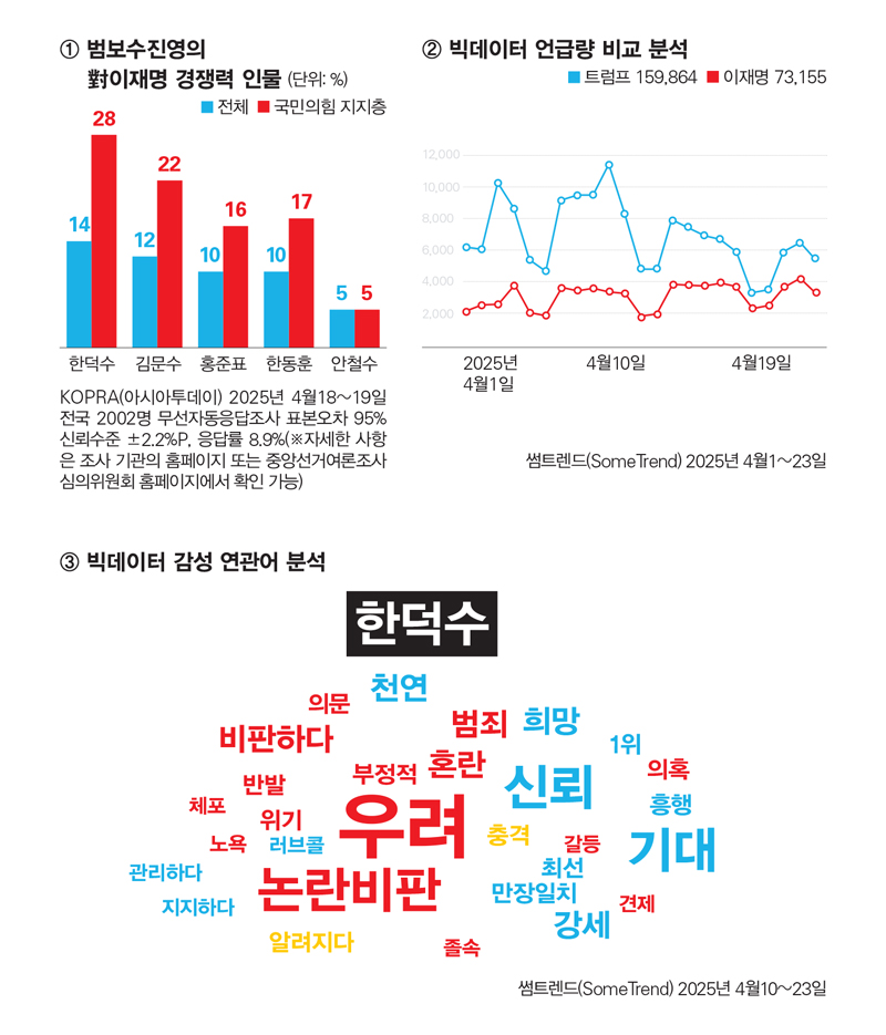 이런 상황에서 ‘이재명 대항마’로 한덕수 대통령 권한대행이 급부상하고 있다. 한국여론평판연구소가 아시아투데이의 의뢰를 받아 4월18~19일 실시한 조사(자세한 사항은 그래프에 표시)에서 ‘이재명 전 대표와 대결해서 대선에서 이길 수 있는 범보수 진영의 인물은 누구라고 생각하는지’ 물어봤다. 국민의힘 지지층 응답자 중 한 대행 28%, 김문수 전 고용노동부 장관 22%, 한동훈 전 국민의힘 대표 17%, 홍준표 전 대구시장 16%, 나경원 국민의힘 의원 6%, 안철수 국민의힘 의원 5%로 나왔다(그림①). 한 대행이 국민의힘 후보들을 앞서는 결과다.