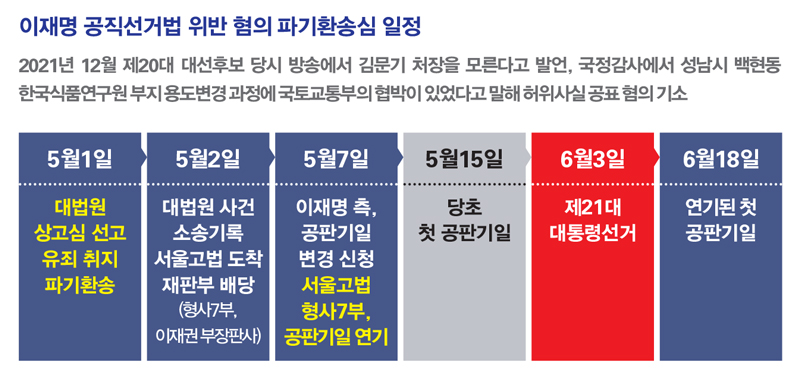 서울고법 형사7부(이재권 부장판사)는 5월7일 “대통령 후보인 피고인에게 균등한 선거운동의 기회를 보장하고 재판의 공정성 논란을 없애기 위해 재판기일을 대통령선거일(6월3일) 후로 변경한다”고 밝혔다. 이는 이 후보 측이 기일 변경을 신청하면서 13쪽짜리 의견서를 제출한 지 불과 1시간 만에 나온 판단이다.