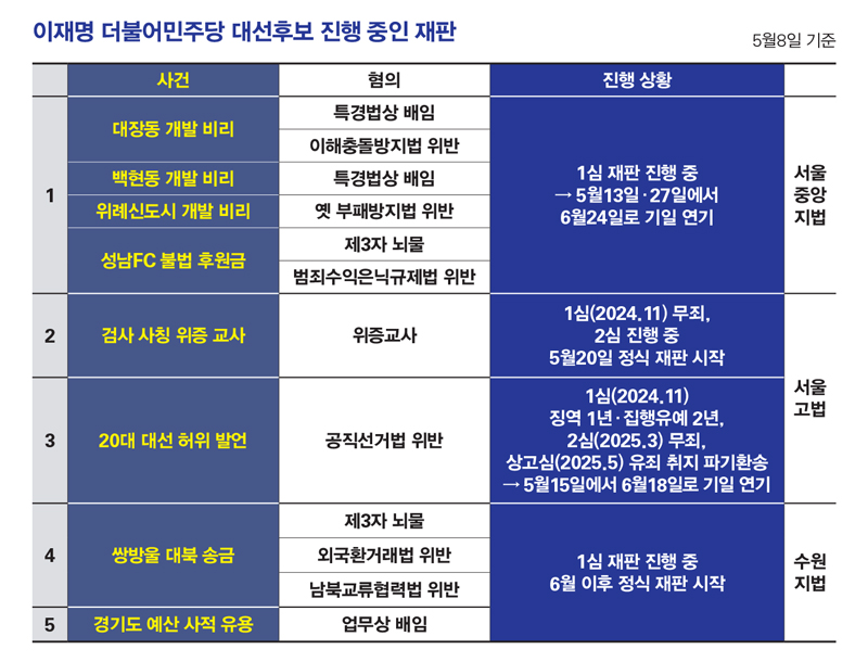 이 후보 측 주장을 수용한 서울고법에 이어 대장동·위례·백현동·성남FC 사건을 심리하는 서울중앙지법 형사합의33부(이진관 부장판사)도 5월13일과 5월27일로 예정됐던 공판을 6월24일로 변경했다. 이 후보 측은 위증교사 사건(1심 무죄) 항소심을 맡은 서울고법 형사3부(이승한 부장판사)에도 5월20일로 지정된 첫 공판기일을 변경해 달라는 신청서를 냈다. 공직선거법 위반 사건을 포함한 형사재판 모두 대선 이후로의 기일 조정이 유력하다.
