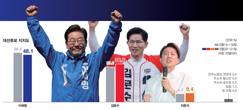 엠브레인퍼블릭·케이스탯리서치·코리아리서치·한국리서치가 5월19일부터 21일까지 만 18세 이상 남녀 1002명을 대상으로 진행한 전국지표조사(NBS) 결과 이재명 후보는 46%, 김문수 후보는 32%, 이준석 후보는 10%의 지지율을 얻었다. 다른 여론조사에서도 유사한 흐름이 나타난다. 리얼미터가 에너지경제신문 의뢰로 5월20~21일 전국 18세 이상 유권자 1012명을 대상으로 대선후보 지지도를 조사한 결과 이재명 후보 48.1%, 김문수 후보 38.6%, 이준석 후보 9.4%로 각각 집계됐다.