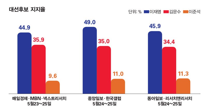 매일경제·MBN과 넥스트리서치가 전국 남녀 1003명을 대상으로 5월23~25일 실시한 조사에서 이재명 후보 지지율은 44.9%, 김문수 후보와 이준석 후보 지지율은 각각 35.9%와 9.6%로 조사됐다. 중앙일보와 한국갤럽이 5월24~25일 전국 만 18세 이상 유권자 1004명을 대상으로 조사한 결과에서는 이재명 후보가 다자대결에서 49%를 얻었다. 이어 김문수 후보가 35%, 이준석 후보는 11%를 얻었다. 동아일보와 리서치앤리서치가 5월24~25일 전국 성인 남녀 1008명을 대상으로 조사한 여론조사에서는 이재명 후보 45.9%, 김문수 후보 34.4%, 이준석 후보 11.3%로 나타났다.