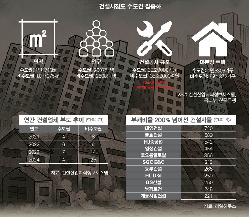 이 중 부채가 자기자본 대비 4~7배에 달하는 태영건설(720%)·금호건설(589%)·HJ중공업(542%)·일성건설(454%) 등은 경남, 전남, 광주 등 비수도권 지역을 중심으로 사업을 추진하는 건설사다. 지역 아파트 미분양 사태로 건설사들이 연쇄 도산할 것이라는 우려가 더 이상 기우가 아님을 보여주는 대목이다.(시사저널 2025년 3월25일 보도 “‘4월 위기설’ 거론되는 건설사 어떤 곳이 있나” 기사 참조)