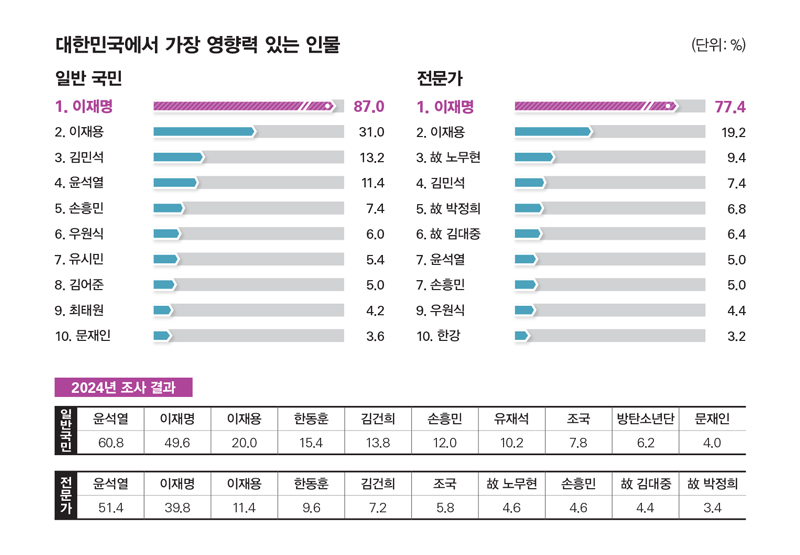 일반 국민과 전문가 모두 ‘이재명-이재용’을 ‘톱2’로 선정했다. 순서도 동일했다. 대한민국의 정치권력과 경제권력이 미치는 막강한 영향력을 확인할 수 있는 순위다. 그다음 순위는 작년과는 적잖이 달라졌는데, 정권 교체가 가져온 영향으로 보인다. 전문가들은 ‘톱10’에 노무현·박정희·김대중 등 세 전직 대통령을 넣어 우리 사회 진보와 보수진영에 여전히 남아있는 고인들의 영향력을 조명한 반면, 일반 국민은 그 대신 문재인 전 대통령을 올려 눈길을 끌었다. 손흥민은 일반 국민과 전문가 모두에서 스포츠계에서 유일하게 선정됐다. 일반 국민은 최근 출판·언론계를 넘어 정치권에도 큰 영향력을 행사하고 있는 유시민 작가와 김어준 총수를, 전문가들은 세계적 반열에 오른 한강 작가를 ‘톱10’에 넣었다.