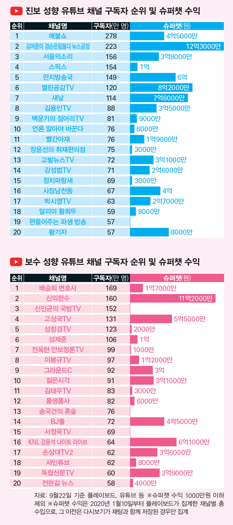 유튜버들이 더 극단적인 목소리를 내는 원인을 ‘수익’에서 찾는 시각도 있다. 구독자와 조회 수가 수익으로 직결되는 유튜브 구조상 핵심 시청자인 강성 지지층의 요구에 계속 동조화될 수밖에 없다는 것이다. 실제 정치 유튜버들은 실시간 방송을 보는 시청자들이 채널에 보내는 후원금인 ‘슈퍼챗’으로 막대한 수입을 올리고 있다. 유튜브 통계 사이트 ‘플레이보드’에 따르면, 올해 들어 국내 슈퍼챗 수입 상위 30개 채널 중 절반가량이 정치 분야 채널이었다. 진보·보수 유튜브 구독자 상위 40개 채널 중 출범 이후 ‘억대 수입’을 기록한 곳은 24개로 절반을 넘었다. 김어준의 겸손은힘들다 뉴스공장은 2023년 1월9일 첫 방송 이후 2년8개월여 만에 12억3000만원의 슈퍼챗을 끌어모았다.