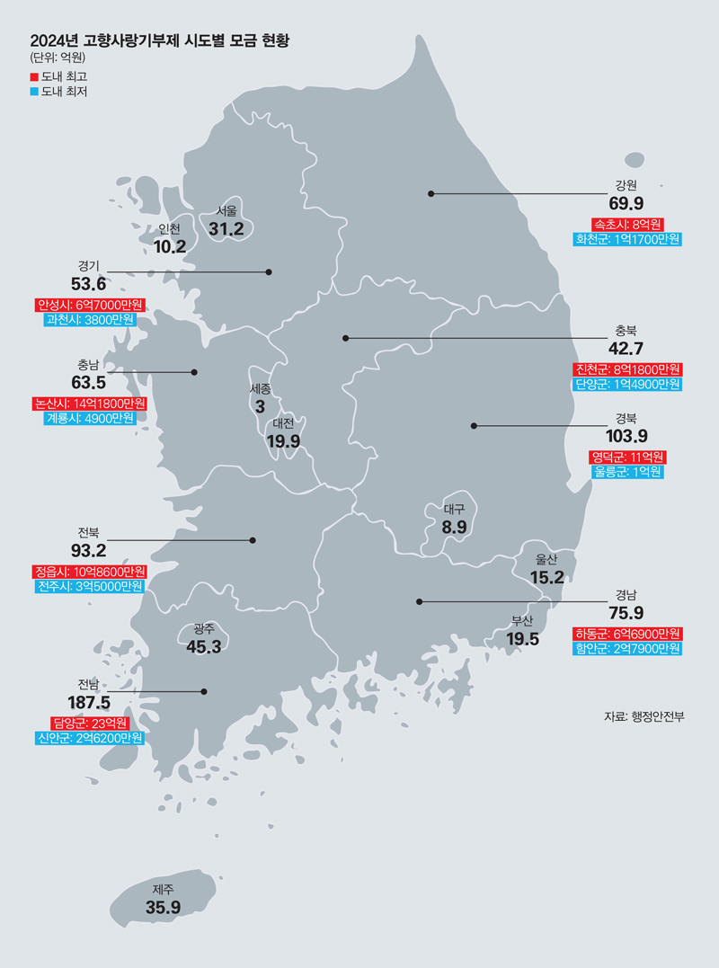 인구 소멸 위기 지역의 모금 실적도 상대적으로 저조한 편이다. 소멸 고위험 지역으로 분류되는 경북 상주시 4억9800만원, 의성군 4억6200만원, 전남 보성군 3억8000만원, 신안군 2억3900만원, 강원도 철원군 4억5600만원 등으로 집계됐다. 적지 않은 금액이지만 지역 위기 극복을 위한 각종 사업에 활용하기엔 아쉬운 실적이다. 226개 지방자치단체(지자체) 가운데 모금액 10억원을 넘긴 곳도 10곳(제주도 제외)에 불과했다.