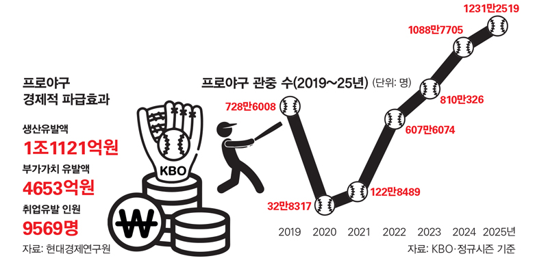 프로야구는 2025년 가장 뜨거운 스포츠였다. ‘1000만 관중 시대’를 열어젖힌 지난해의 기록도 깼다. 올해 정규시즌까지 1200만 명이 넘는 관중이 경기장을 찾으며 열기를 입증했다. 역대 최초로 10개 구단의 개막전 티켓이 모두 매진되며 시작된 프로야구의 파급력은 경기장 안에만 머물지 않았다. 인근 상권의 매출을 끌어올리고 온라인동영상서비스(OTT) 플랫폼 트래픽까지 치솟게 하면서 생태계 전반으로 확산됐다는 평가다. 프로야구가 만들어내는 소비지출 효과만도 1조원 이상으로 추정된다. 프로야구가 흥행을 넘어 산업을 움직이는 새로운 동력으로 부상하면서 국가 경제의 새로운 자산으로 삼아야 한다는 주장도 나온다.