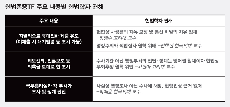 특히 공직자에게 휴대전화를 제출할 수 있도록 유도한다는 방침은 개인의 사생활·통신비밀 자유와 영장주의·적법절차 원칙 등 위헌 소지 가능성도 제기됐다. 이번 TF 활동 방침이 여대야소(與大野小) 정국에서 이재명 정부의 일사불란한 행정 장악을 위한 조치인지, 나아가 반(反)정부 인사를 가리기 위한 ‘블랙리스트’로 확산될지를 두고 논란이 뜨겁다.