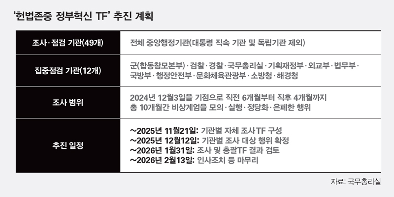 그런데 돌연 변수가 발생했다. 정부가 특검 수사와는 별개로 ‘내란 공무원’을 직접 색출하겠다며 ‘헌법존중 정부혁신 TF’를 출범시킨 것이다. “특검이 연장되는 바람에 지금 시점에서 이 조사를 하지 않으면 내년 인사에 반영할 수 없다”(우상호 대통령실 정무수석)는 게 정부의 설명이다. TF는 중앙행정기관 49개를 대상으로 비상계엄에 연루된 공무원들을 솎아내기 위해 인터뷰 심문, 서면조사, 디지털 포렌식 등을 활용할 계획이다. 특히 비상계엄에 연루된 것으로 의심받는 공무원에게 휴대전화를 자발적으로 제출할 것을 유도하고, 해당자가 이에 협조하지 않으면 대기발령·직위해제 후 수사 의뢰하는 방법도 고려할 방침이다.